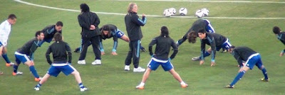 Como ya es frecuente en Sudáfrica 2010, Maradona alienta a cada uno de los jugadores mientras Fernando Signorini organiza la entrada en calor.