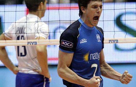Facundo Conte, otra vez de los mejores de Argentina, festejando uno de sus 22 puntos. El receptor punta fue el goleador del partido. Su padre Hugo, histórico del vóley mundial, vio una vez más, otra gran tarde de su hijo y apoyó a la selección muy cerca del banco como en todos los partidos de Italia 2010.