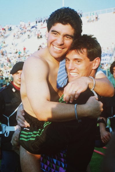 45) Abrazando a Goycochea, figura en la victoria por penales ante Yugoslavia en Cuartos de final. Fue 0-0 luego en 120 minutos y a Maradona le habían atajado el penal en la definición.