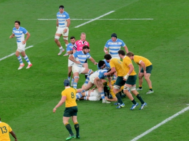 Como todos los partidos del mundial, Los Pumas salieron con la intención de ganar el partido, con una actitud que era imposible poner ese ímpetu en discusión por más que enfrente estaba tal vez el mejor equipo de la Copa. Y eso se notó en el desarrollo del juego. Los australianos se pusieron rápidamente 7-0 que aprovecharon un error de pase de Nicolas Sánchez. Y a este nivel, las potencias no te perdonan un error: Rob Simmon adivinó la jugada interceptó el pase y apoyó el primer try de los Wallabies en el partido. Ahí estuvo la diferencia. Los Pumas lograron descontar por medio de la certera puntería de Nico Sanchez en los penales, pero Australia amplió facilmente la diferencia con otro try. Una tarjeta amarilla a Tomás Lavanini, lo que lo obligó a quedarse diez minutos afuera, y la lesión de Agustín Creevy, que obligó a realizar un cambio, hizo que Australia lo aprovechara y continuara ampliando su poder en el juego y se fue al descanso ganando 19-9.